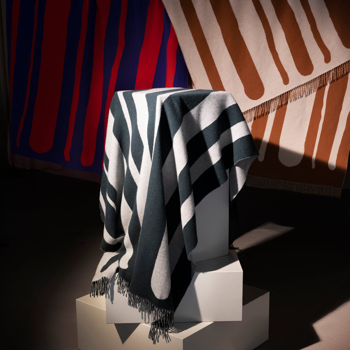 “Mange betragter et tæppe som et todimensionalt objekt, men det er faktisk tredimensionelt, og det demonstrerer Brush gennem en leg med linjer og teksturer. De omhyggeligt udvalgte farvekombinationer er skabt med penselstrøg, som også gav inspirationen til kollektionens navn. Tæppernes to sider er vævet, så de viser modsatte farver – en ‘negative’ og en ‘positiv’ side. Det visuelle sprog ændrer sig, afhængigt af hvilken side man vælger at vise frem, og hvordan tæppet er foldet.”